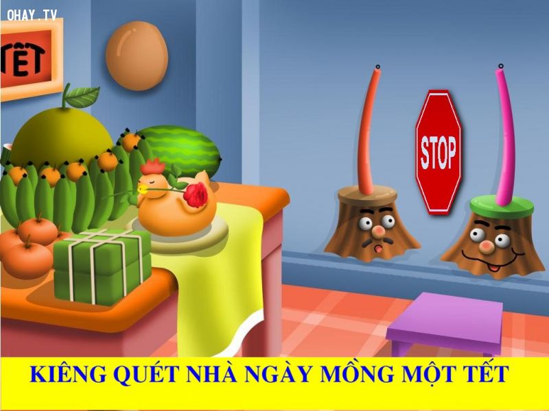 1/ Kiêng Quét Nhà – Theo quan niệm của Người Việt, nếu quét nhà trong 3 ngày đầu năm mới thì Thần Tài sẽ đi mất, tiền bạc sẽ không ở lại với gia đình, thậm chí còn mang lại điềm xấu. Có lẽ do một điển tích của Trung quốc: Trong “Sưu thần ký” có chuyện người lái buôn tên Âu Minh, khi đi qua hồ Thanh Thảo thì được Thủy Thần ban cho một người hầu tên Như Nguyệt. Sau vài năm, Âu Minh làm ăn phát đạt và trở thành người giàu có. Mồng Một Tết năm nọ, Âu Minh tức giận đánh Như Nguyệt. Nàng sợ quá chui vào đống rác và biến mất. Từ đó, nhà Âu Minh cứ nghèo dần đi. Theo đó, mọi người kiêng không dám quét nhà và không đổ rác trong mấy ngày Tết.